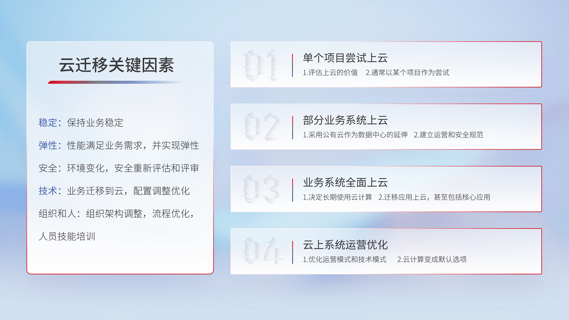 结合实际业务,,从规划设计、、云平台选型、、、、云原生改造、、、、数据迁移、、、、集成交付,,,,迁移全过程为客户识别最佳上云路径,,,,做好风险识别管理,,,设计网络架构、、、、身份权限、、、、安全审计合规、、、、操作审计、、、、日志审计、、监控告警策略、、、多站点容灾设计等,,,对云上基础设施进行整体规划,,提升IT治理水平,,,以满足弹性、、高可用、、、、高性能的需求。。