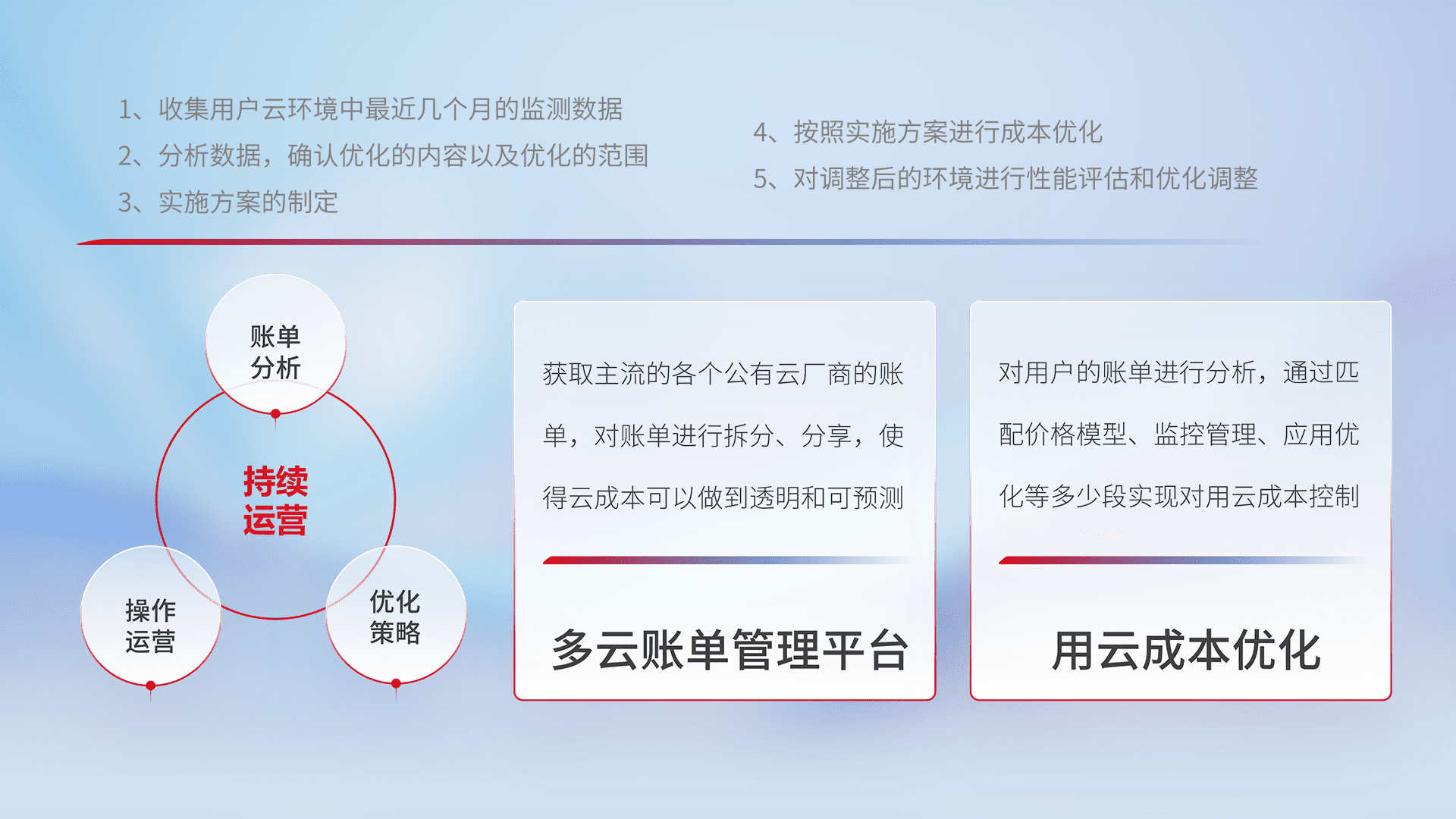 通过多云纳管,,,,以统一的资源数据模型把客户的云资源进行抽象和封装,,,,进而实现对多云资源的统一操作,,保障云资源管理的可靠性、、稳定性与可用性。。量身定制化运维内容,,配置、、、、开发运维、、、、补丁管理、、、备份、、、监控、、、认证和访问管理、、、审计和日常巡检等,,,,保障在用云过程中的可靠度,,稳定度以及高可用率。。