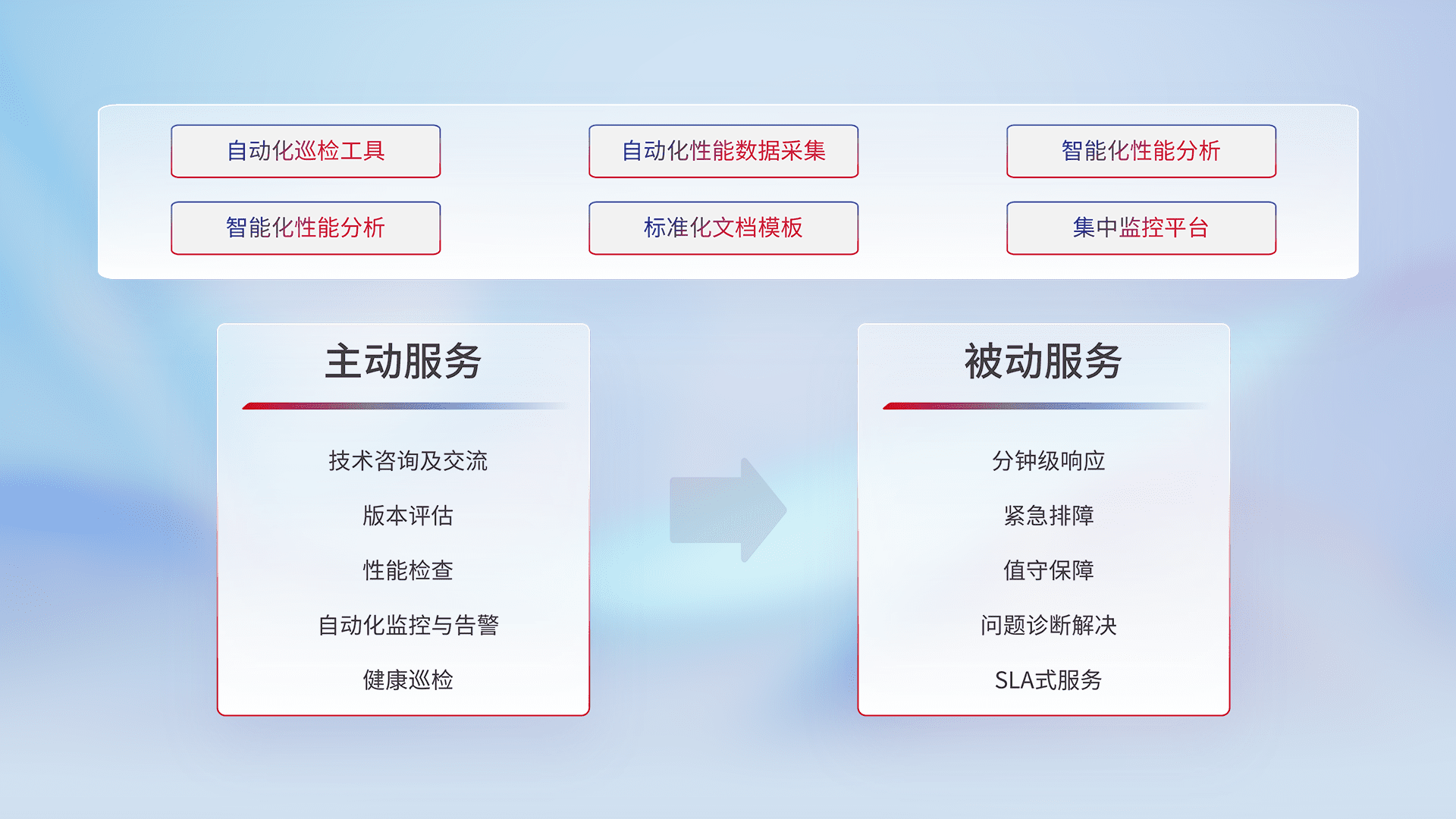 智能化工具和标准化文档,,,保障服务质量,,,,提供主动服务(包含技术咨询、、、、版本评估、、、、性能检查、、自动化监控与告警、、健康巡检)和被动服务包含(分钟级响应、、、、紧急排障、、、值守保障、、问题诊断解决、、SLA服务)。。